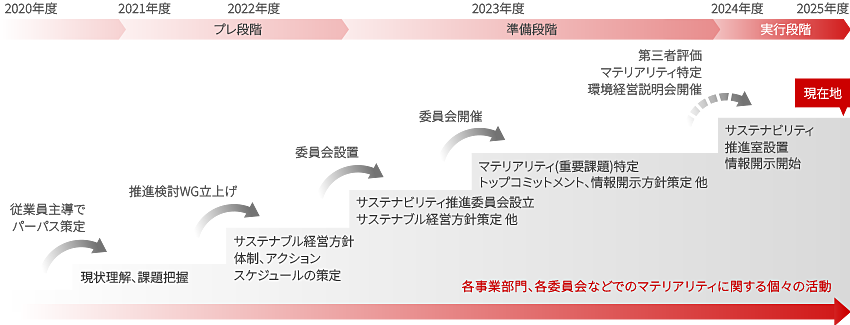 当社では2020年度にパーパスを策定後、2021年度に推進検討WG(ワーキンググループ)を立上げ、サステナブル経営推進に向けた社内準備を開始しました。2022年度にはサステナビリティ推進委員会を立上げ、2023年にかけて、方針の策定、マテリアリティの特定を実施しました。