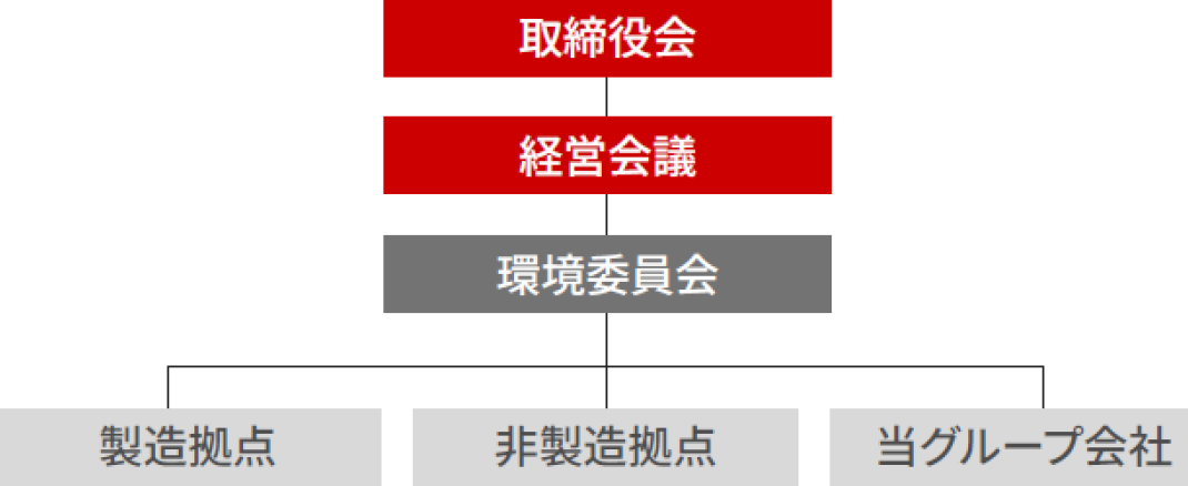 環境委員会は、取締役社長を委員長、各部門の管掌役員および事業の実行責任者を委員とする体制により、グループ全体の事業戦略や方針、「環境行動計画」を審議・決定しています。また、業務の改善および環境活動の向上を図るとともに、環境に関連した問題発生の未然防止施策も検討しています。本委員会での決定事項をもとに、製造拠点および非製造拠点(本社、営業、サービス拠点)、当グループ会社が一体となって、各施策を推進しています。