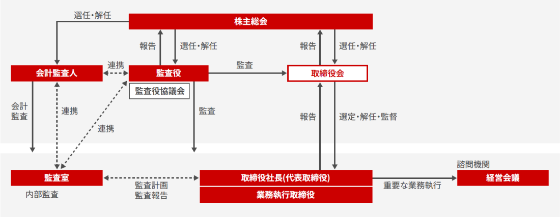 当社は、「監査役設置会社」の形態を採用しています。取締役会は、内部統制システムの整備をはじめとする業務執行の決定機能とともに、取締役の職務執行の監督機能を担い、企業統治の基本的枠組みが適正、妥当かつ効率的に設計されていることを監視しています。監査役は、取締役の職務執行の全般を監査しています。