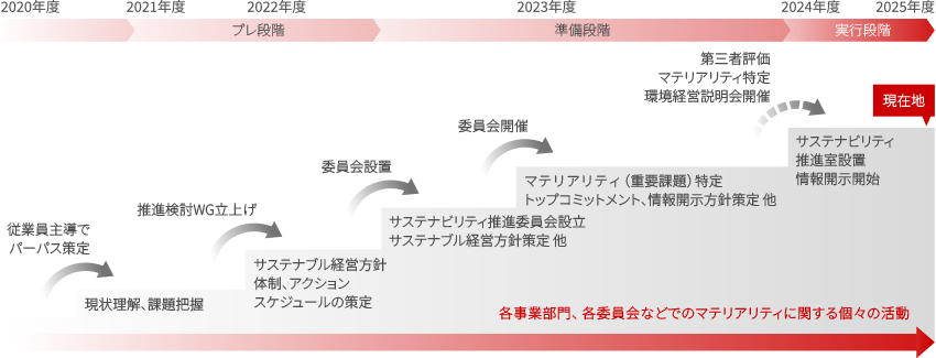 当社では2020年度にパーパスを策定後、2021年度に推進検討WG(ワーキンググループ)を立上げ、サステナブル経営推進に向けた社内準備を開始しました。2022年度にはサステナビリティ推進委員会を立上げ、2023年にかけて、方針の策定、マテリアリティの特定を実施しました。