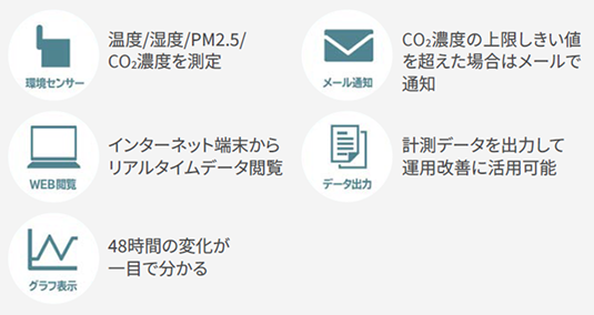 室内に設置したセンサーにより計測した空気質の数値を表示。また、CO2濃度があらかじめ設定した値(しきい値)を超えると、換気装置を連動制御。換気を進めることで室内環境の改善に貢献。