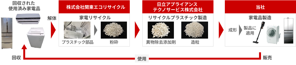 当社はこの課題に対し、当グループ内の家電リサイクルのノウハウと、長年培ってきたプラスチックの製造・活用技術を結集。廃棄から製造へとつなぐ、グループ一体のリサイクルプロセスを構築しました。