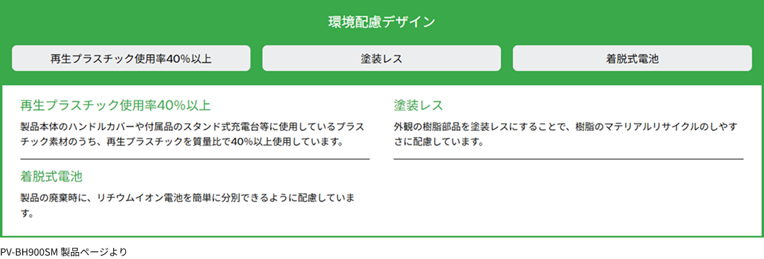 本製品では、2023年度モデルPV-BH900SLと同様、製品本体のハンドルカバーや付属品のスタンド式充電台等に使用しているプラスチック素材のうち、再生プラスチックを質量比で40%以上使用しています。また、使用する再生プラスチックの種類を入手しやすさや質感の観点から見直し、高い品質感を保ちながら積極的に活用しています。