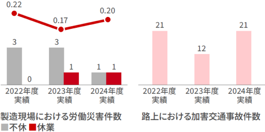 安全については、請負事業者等を含めた全従業員の「休業災害ゼロ」をめざし、死亡・休業災害のみならず、不休災害を含むTRIFR(総災害発生率)*1をKPI*2の目標値に定め、従業員一人ひとりが「休業災害ゼロ」の実現に自分ごととして取り組んでいます。