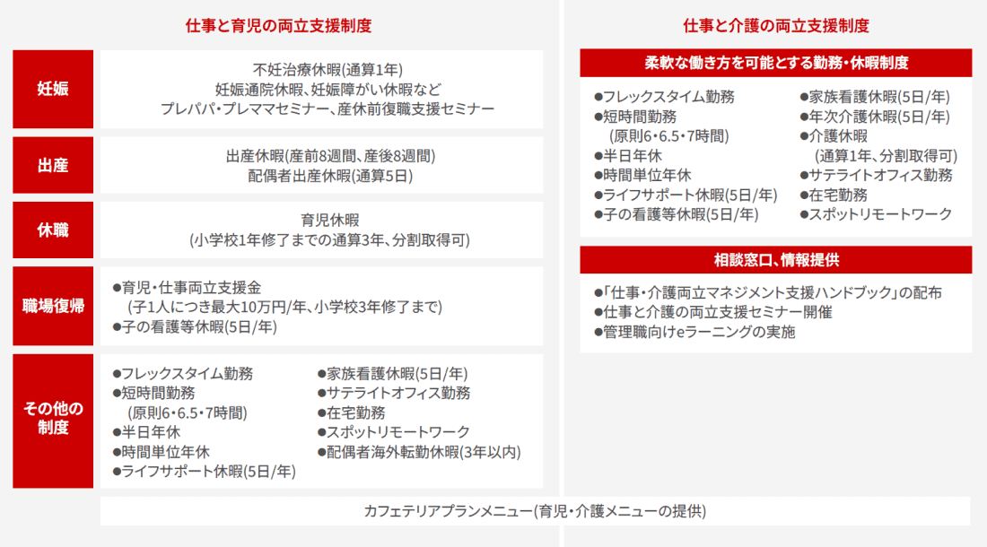 従業員がさまざまなライフイベントと仕事を両立し活躍し続けることができるように、仕事と育児・介護の両立支援のための制度を法定を上回る水準で整備しています。また、経営幹部メッセージの配信や、仕事と育児・介護を両立している従業員の紹介、セミナーの開催、育休取得宣言など、職場でのコミュニケーション促進や理解向上に向けた施策等により、対象となる従業員全員が各種制度を利用しやすい風土づくりにも取り組んでいます。